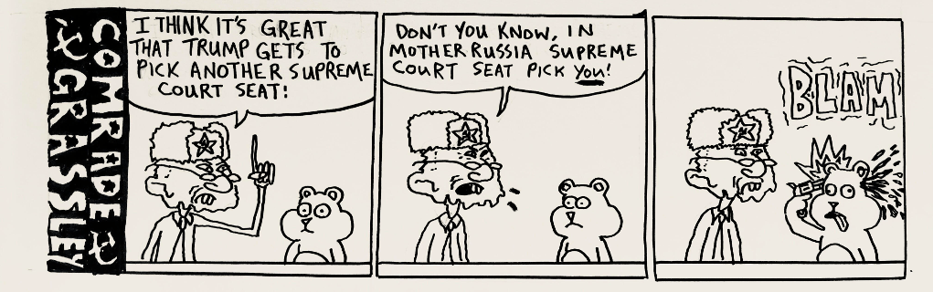 Sam Locke Ward is an artist and lifelong Iowan. As a cartoonist and musician he has a created a fairly large amount of DIY records and comic zines as well as the ongoing comic strip Futile Wrath for Little Village magazine. Charles Grassley became a senator one year before he was born in 1982.