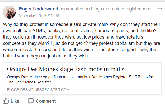 Other comments Underwood has shared on social media further illustrate his apparent lack of empathy for historically oppressed groups and disdain for protesters, including tweets criticizing the Standing Rock Sioux Tribe for spending donations on its casino, which it relies upon for revenue and suffered because of the Dakota Access pipeline protests; and the Occupy Wall Street movement.