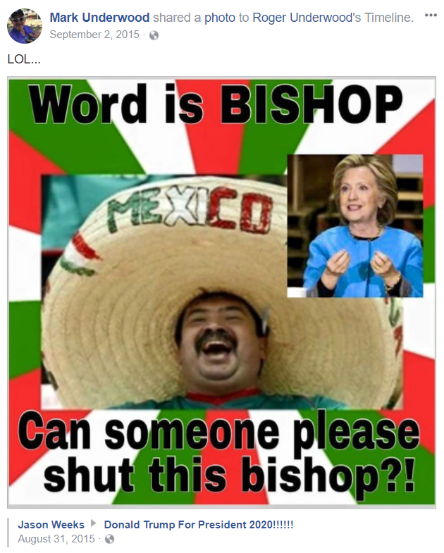 His brother Mark, a Sioux City resident who owns two Sonic Drive-In restaurants, has also posted sexist messages on Underwood’s Facebook wall, one calling Clinton a bitch and another jokingly criticizing women for being annoying. Underwood did not respond to the messages, but he also did not delete them and they remain visible on his public profile. (Update: Following the publication of this article, Underwood no longer has a public Facebook account.)