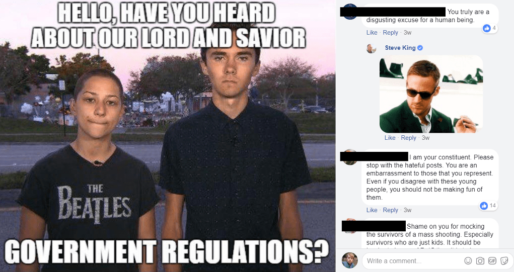 Ever since survivors of the Marjory Stoneman Douglas High School mass shooting massacre in mid-February began demanding stronger gun laws in America, Steve King’s congressional campaign staffers — likely members of his own family — have been posting memes on Facebook mocking the students for their efforts. Here are some examples dating back to March 2: