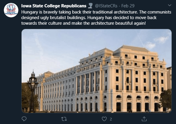 In February, the ISU College Republicans expressed support for an effort by one of King’s favorite far-right European leaders, the Hungarian autocrat Viktor Orban, to redesign government buildings in the interest of promoting nationalism and erasing the communist influence behind their bland designs. (Incidentally, the press release from the Iowa Federation of College Republicans that the ISU College Republicans endorsed in June 2018 included criticism of the state’s public universities for spending funds on “lavish buildings that are far more extravagant than any Iowan would expect or need.”)