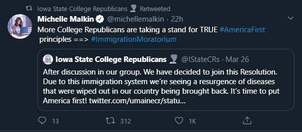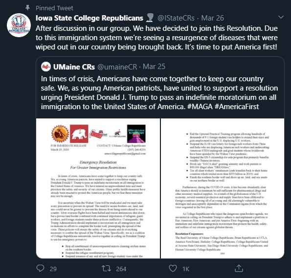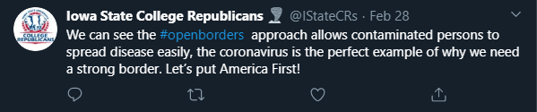The tweets were posted after Labruna was recruited by the White House, but they were consistent with numerous other viewpoints from the account that predated the news of his new job. On February 28, for instance, the ISU College Republicans argued that an open border policy “allows contaminated persons to spread disease easily” and that “the coronavirus is the perfect example of why we need a strong border.” In reality, US citizens returning from traveling abroad appear to have been the source of much of the initial spread of the virus to the country.