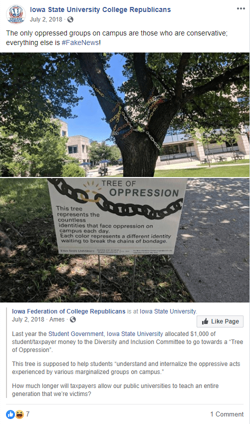 The ISU College Republicans repeatedly downplayed and mocked efforts to address these problems. In a July 2018 Facebook post protesting the student government’s decision to allocate money to a diversity and inclusion committee for a “Tree of Oppression” landmark on campus, the group wrote, “The only oppressed groups on campus are those who are conservative; everything else is #FakeNews!”