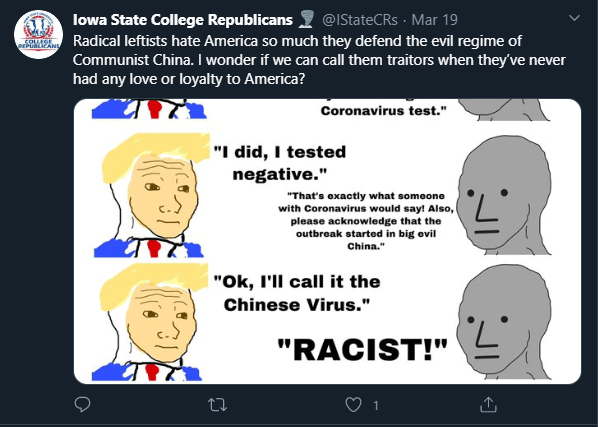 A week earlier, the College Republicans dismissed the notion that Trump calling the coronavirus the “Chinese virus” was racist, sharing an image featuring the popular pro-Trump NPC meme and conflating criticism of the president’s xenophobic language with support for communism.