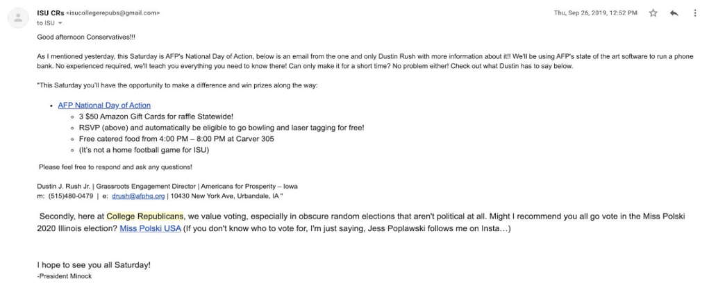 Minock is accused of racism by a former board member who claims that he “referred to Fridays as ‘Hard R Fridays’ in front of College Republican members and would use the n-word in public conversation.” The document also addresses a notorious event in March 2019, when a white nationalist named Nick Fuentes visited campus. At the time, both Minock and the College Republicans denied involvement in the event, despite an email showing that Minock promoted it to members of the group. In turn, Minock blamed the controversy on Ryan Hurley — the group’s current president — who he claimed invited Fuentes on behalf of the campus chapter of Turning Point USA, a right-wing nonprofit founded by Charlie Kirk. “Mr. Minock admitted to a member that he was the sole person responsible for inviting Nick Fuentes to campus, having emailed Fuentes about coming to Iowa State months before the event happened,” the document claims.
